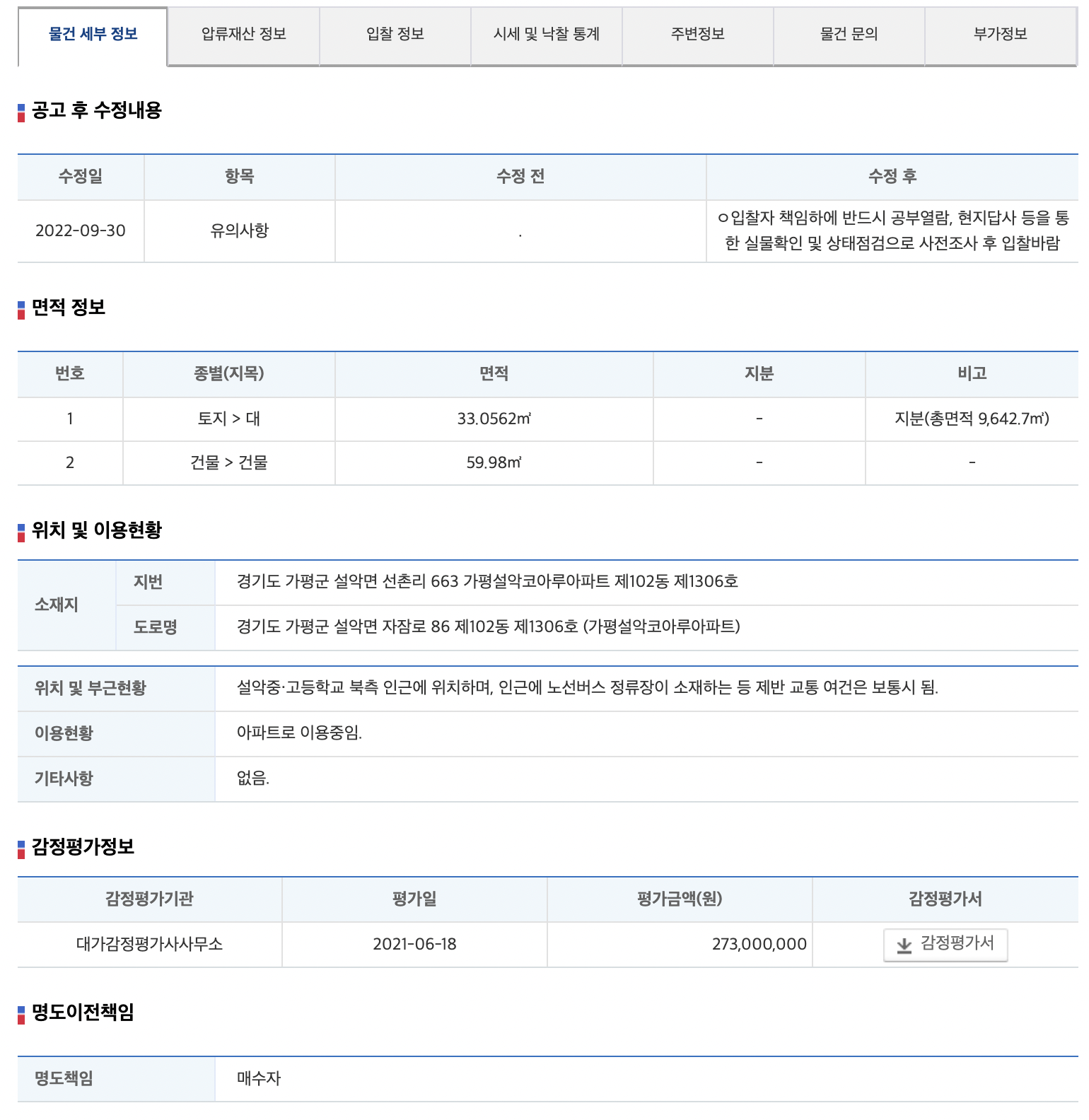물건 세부 정보에서는 면적 정보 위치 및 이용현황 감정평가정보를 확인할 수 있다. 감정평가서를 다운받아 볼 수 있다. 그리고 명도이전 책임에 대한 안내가 나와있다.