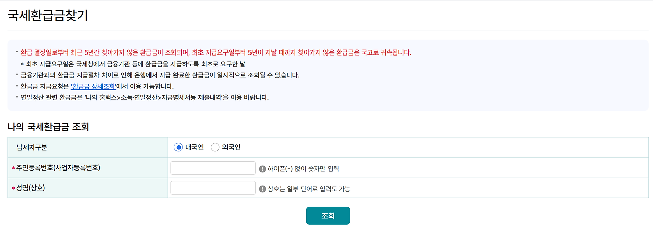 - 정보 입력 및 조회: 주민등록번호와 이름을 입력하고 '조회' 버튼을 누르면 환급금 존재 여부를 확인할 수 있습니다.